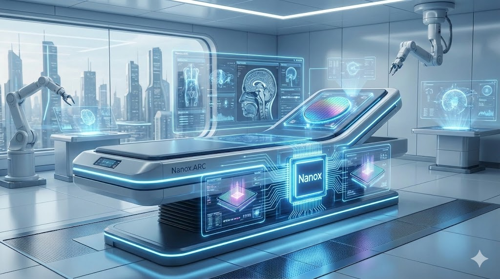 열이 안 나니까 거대한 냉각기가 필요 없고, 장비는 가벼워지고, 가격은 획기적으로 싸집니다. 이 기술을 적용해 만든 장비가 바로 '나노엑스 아크(Nanox.ARC)'입니다. SF 영화에 나오는 침대처럼 생겼죠?